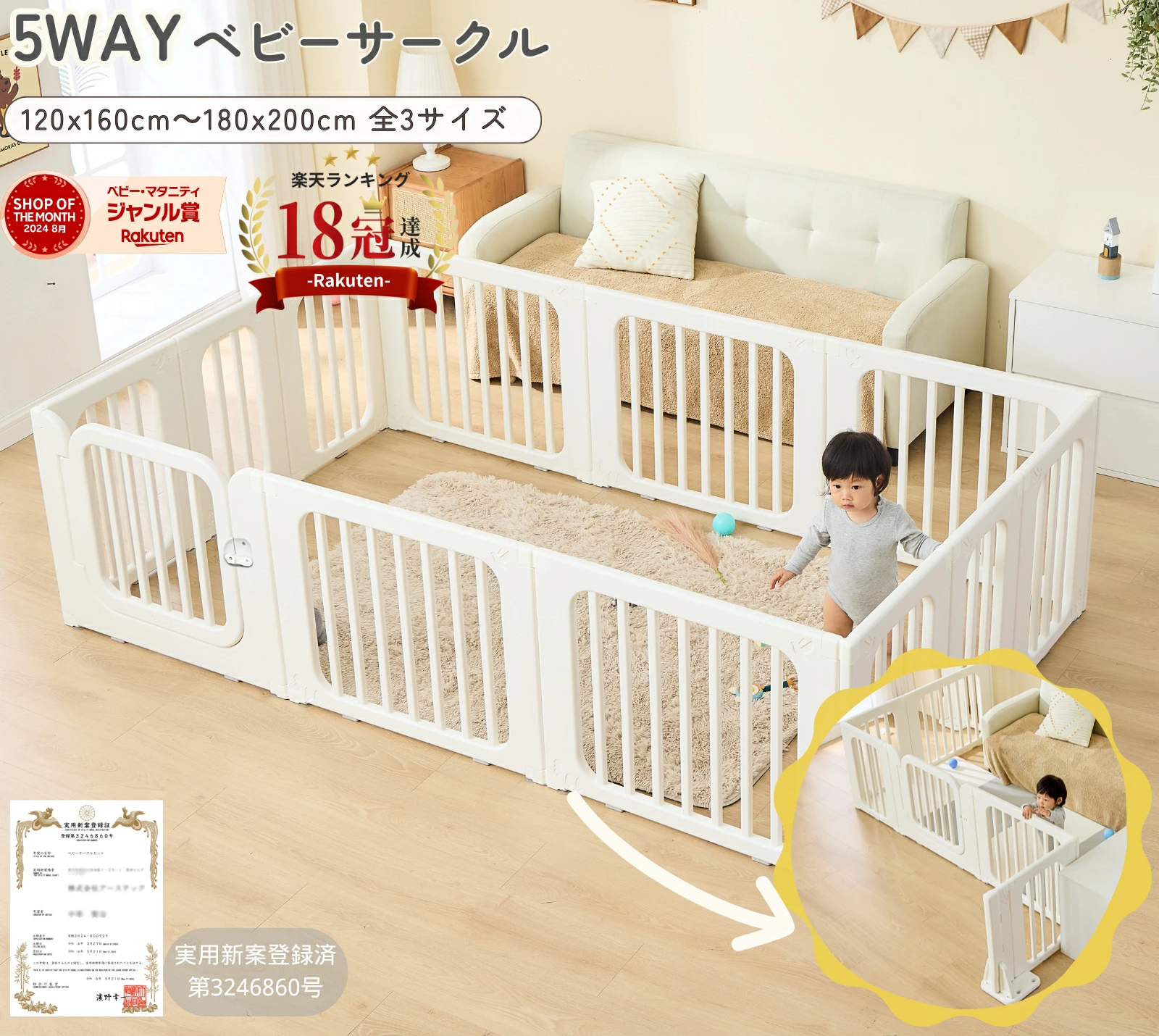 お子さまの成長に合わせて形を変えられるのが、この商品の最大の特長です。ベビーサークルベビーベットベビーゲート棚・キッズパーテーションになります。